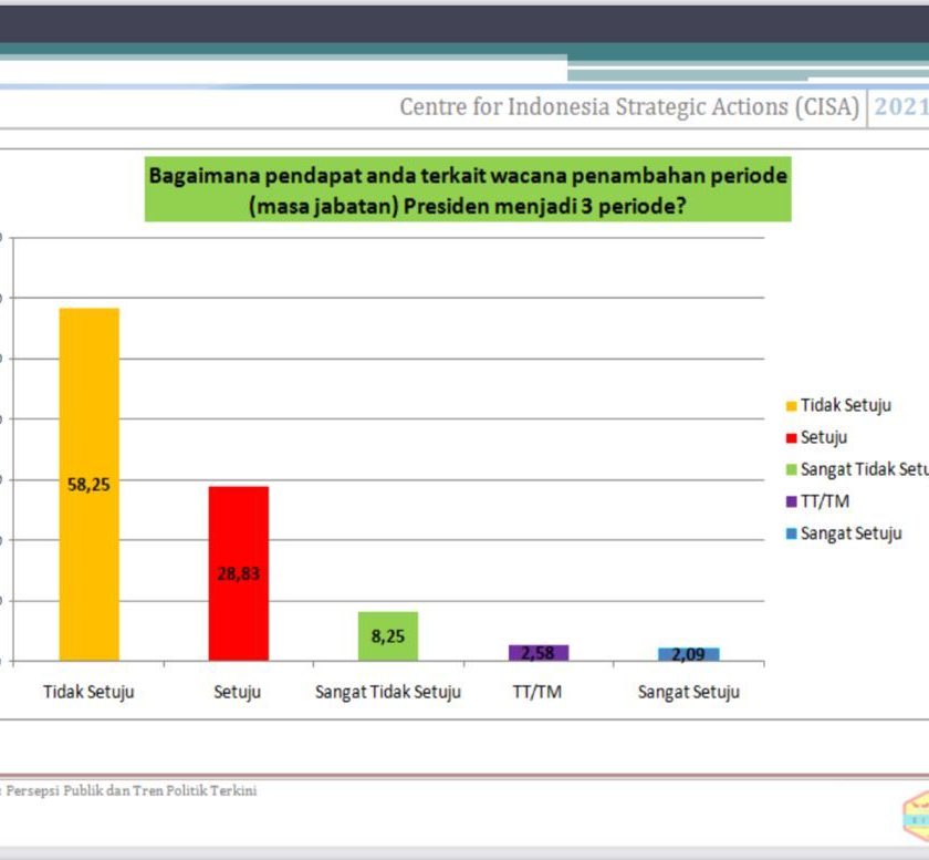 JAKARTA, Swarakaltim.com – Masih dalam rilis Survei Centre for Indonesia Strategic Actions (CISA) yang disiarkan Jumat (3/9/2021) kemaren, menyatakan penolakan terhadap wacana penambahan masa jabatan Presiden/Wakil Presiden menjadi 3 (tiga) periode