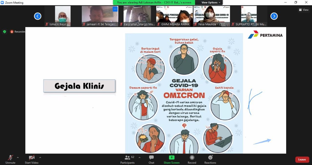 Materi sosialisasi yang bertema “Pencegahan Penyebaran Covid-19 dan Cara Menyikapinya di Lingkungan Warga Yang Terpapar” dibawakan oleh dr Bintang selaku dokter yang bertugas di Pertamina Patra Niaga Regional Kalimantan.