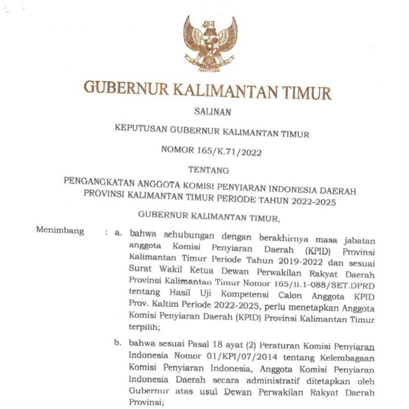 SAMARINDA, Swarakaltim.com – Akhirnya Surat Keputusan (SK) Gubernur Kalimantan Timur tentang Pengangkatan Anggota Komisi Penyiaran Indonesia Daerah (KPID) a