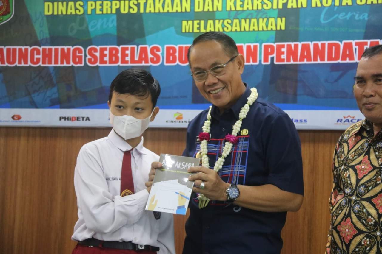 Teks: Wawali melauching 11 buku antologi SDN 007 Samarinda Ilir di aula Dispursip Samarinda.