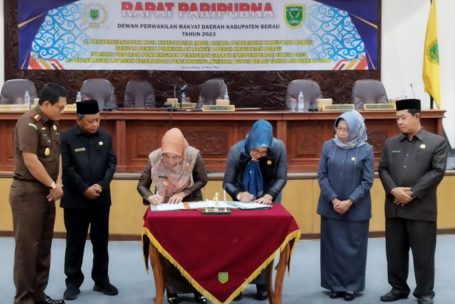 TANJUNG REDEB, Swara Kaltim – Badan Pembentukan Peraturan Daerah (Bapemperda) DPRD Kabupaten Berau sepakat dengan Pemerintah Kabupaten (Pemkab) Berau bahwa melalui Program Pembentukan Peraturan Daerah (Propemperda) tahun 2023 bakal lahirkan sebanyak 12 Rancangan Peraturan daerah (Raperda). Penandatanganan MoU akan hal itu dikemas DPRD dengan menggelar rapat paripurna bertempat diruang rapat utama kantor DPRD, Jl Gatot Subroto, Kecamatan Tanjung Redeb, Selasa (21/03/2023).