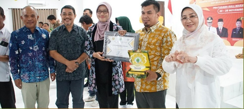 Caption: Penyerahan hadiah oleh Sekretaris Provinsi Katim, Sri Wahyuni ke Pokdarwis Batu Payung yang didampingi Bupati Sri Juniarsih Mas dan Kepala Disbudpar Ilyas Natsir.