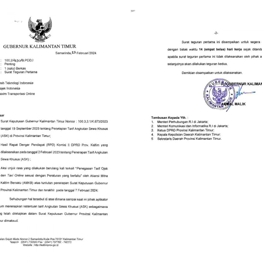 SAMARINDA, Swarakaltim.com – Pemerintah Provinsi Kalimantan Timur memberikan surat teguran pertama kepada tiga aplikator penyedia jasa ojek dan taksi online. Ketiganya adalah Grab Teknologi Indonesia, Gojek Indonesia, dan Maxim Transportasi Online. Dalam surat bernomor 100.2/4130/.B.POD.I yang ditandatangani oleh Pj Gubernur Kaltim Akmal Malik pada Kamis (22/2/2024), diungkapkan bahwa teguran itu diberikan lantaran ketiga aplikator belum […]