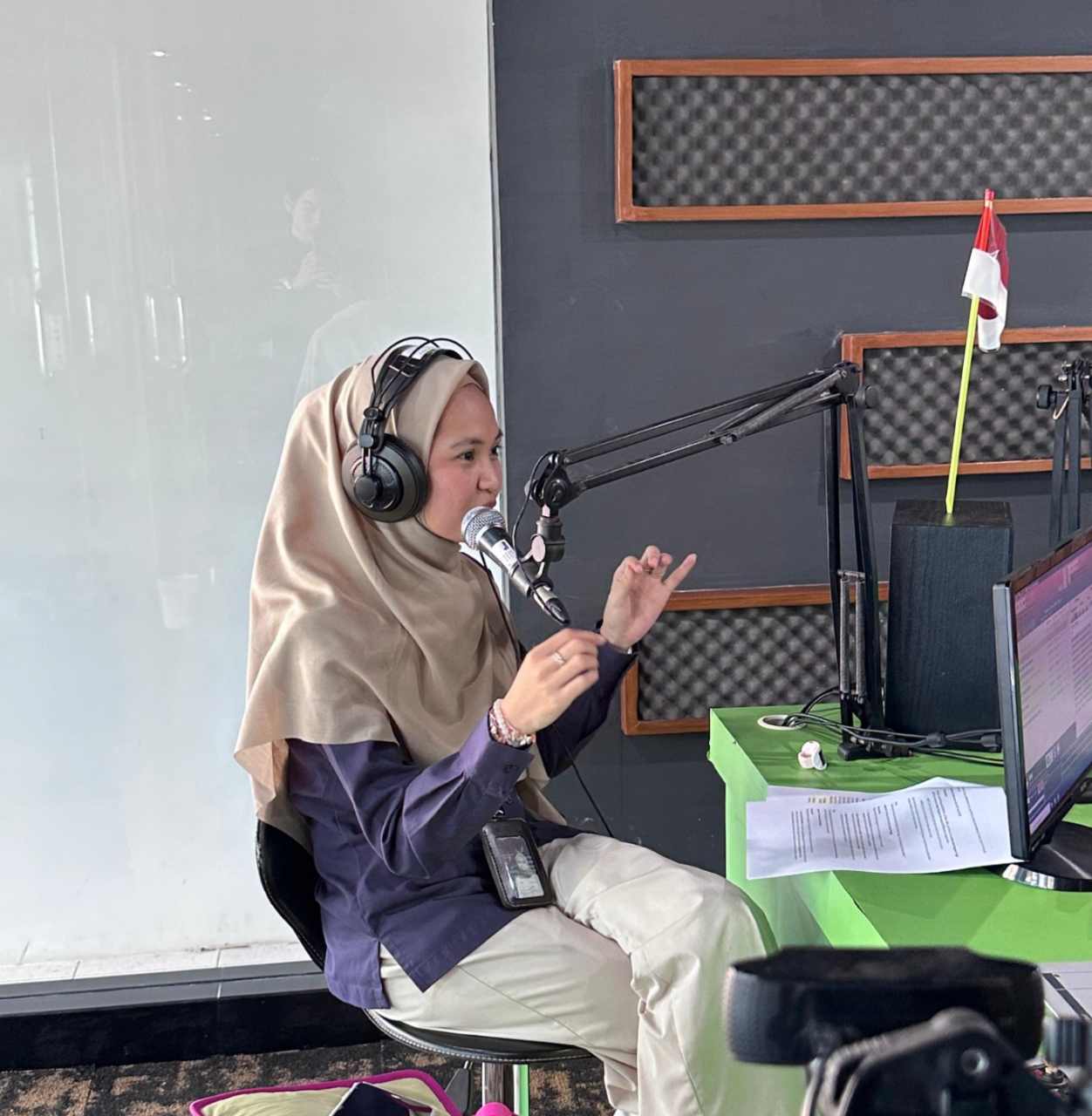 Sesi podcast interaktif tentang edukasi kelistrikan yang dipandu oleh Fauziah Dwi Gustia (kiri) selaku Team Leader Keselamatan dan Kesehatan Kerja PLN UP2B Kalbar, bersama Wiwin Indriani (kanan) selaku host podcast RRI Kalimantan Barat.