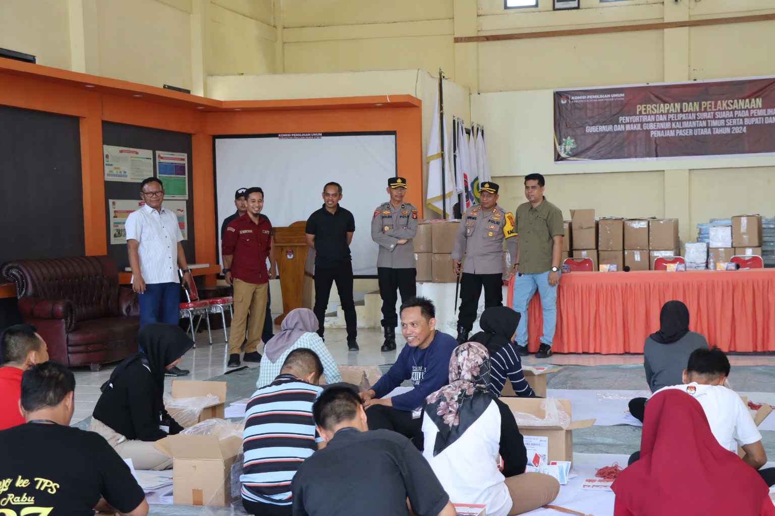 Kegiatan penyortiran dan pelipatan kertas surat suara dilakukan di Gudang Logistik KPUD Penajam Paser Utara yang di pimpin Ketua KPU Ali Yamin Ishak, dihadiri juga Pj Bupati PPU Dr. M Zainal Arifin S.Hut M.Si dan para peserta yang akan melakukan penyortiran dan pelipatan suara.