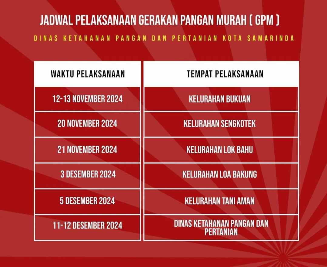 Jangan sampai ketinggalan, pastikan Anda mencatat jadwalnya dan manfaatkan kesempatan ini untuk berbelanja bahan pokok dengan harga yang ramah di kantong. Untuk informasi lebih lanjut, warga bisa melihat jadwal lengkap di infografis yang sudah disediakan oleh Dinas Ketahanan Pangan dan Pertanian Samarinda.