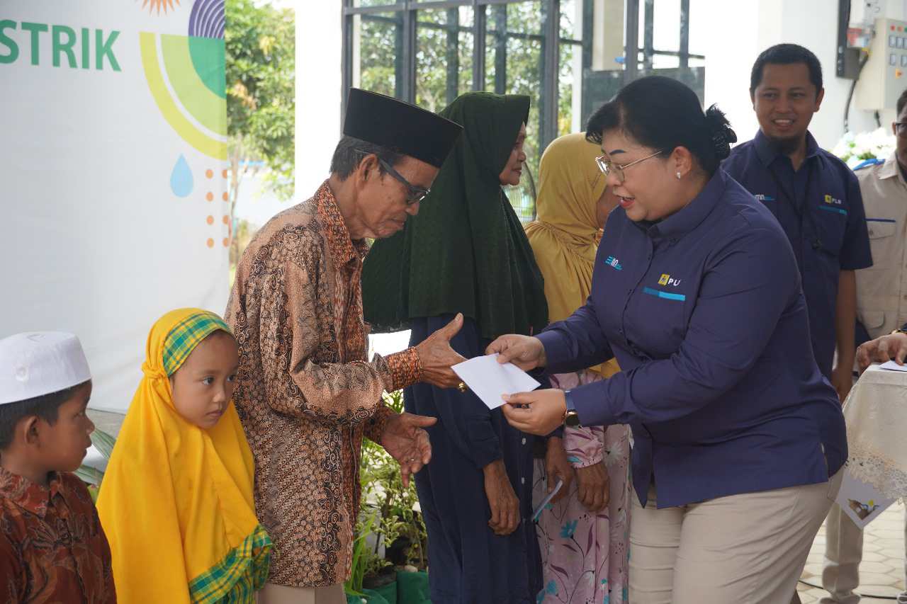 Rahayu Arimbi, Senior Manager Keuangan, Komunikasi dan Umum PLN UIP3B Kalimantan (kanan) menyerahkan santunan kepada kaum dhuafa di sekitar lingkungan kerja ULTG Batulicin