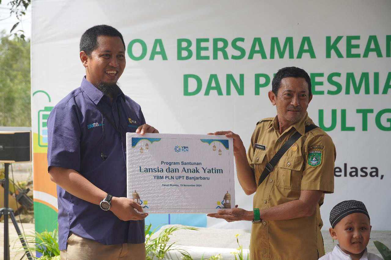Akhmad Fauzan, Manager UPT Banjarbaru (kiri) secara simbolik menyerahkan santuan lansia dan anak yatim dari YBM PLN UPT Banjarbaru