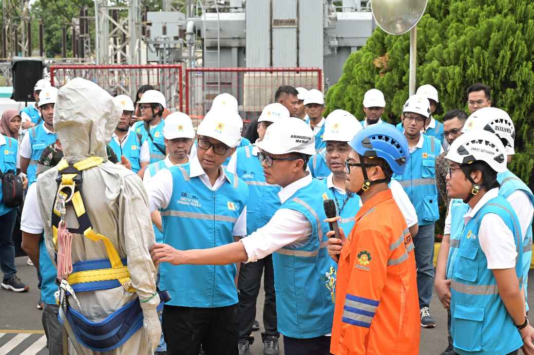 Wakil Menteri BUMN, Aminuddin Ma’ruf (kedua dari kiri depan) didampingi Direktur Utama PLN, Darmawan Prasodjo (kiri depan) dan General Manager PLN Unit Induk Transmisi Jawa Bagian Barat, Jarot Setyawan (kanan depan) melakukan inspeksi peralatan pendukung operasional kelistrikan saat melakukan peninjauan di Kantor PLN Unit Pelaksana Transmisi Cilegon pada Selasa (24/12). Pada periode Siaga Natal dan Tahun Baru 2025 ini, PLN mengerahkan 81.591 personel dan menyiapkan 4.336 posko siaga di seluruh Indonesia.
