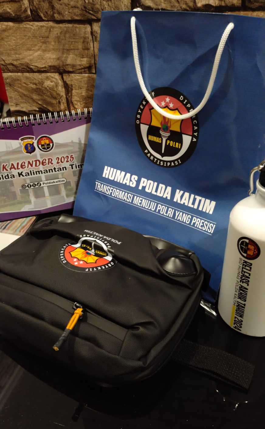 Sebagai bentuk ucapan selamat datang dan terima kasih serta bentuk syukur pada Tuhan YME Polda kepada para undangan yang telah berkenan hadir pada acara tersebut, Polda Kaltim menyampaikan tas jinjing (paper bag) bertuliskan Humas Polda Kaltim “Transformasi Menuju Polri yang Presisi” dengan isi di dalamnya berupa tas kecil, botol minum mini, kalender beserta notes.