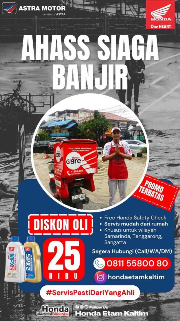 “Banjir dibeberapa wilayah Samarinda tentu menjadi hal perlu diwaspadai bersama. Kami berharap melalui program AHASS siaga banjir dan layanan HondaCare yang kami miliki, dapat menjadi solusi atas kondisi sepeda motor para konsumen setia Honda yang terdampak banjir agar bisa melakukan pegecekan dan perawatan kondisi sepeda motor dengan mudah, ” ungkapnya.