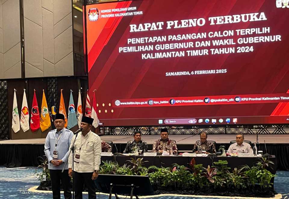 SAMARINDA, Swarakaltim.com – Komisi Pemilihan Umum (KPU) Kalimantan Timur secara resmi menetapkan pasangan Rudy Mas’ud dan Seno Aji sebagai Gubernur dan Wakil Gubernur Kaltim terpilih untuk periode 2025-2030. Keputusan ini diumumkan dalam Rapat Pleno Terbuka yang digelar di Hotel Mercure, Samarinda, pada Kamis (6/2/2025) malam.