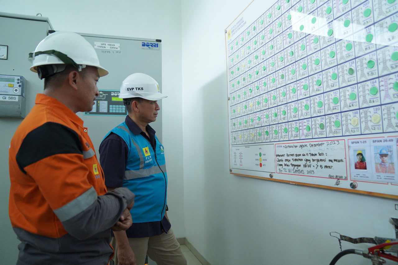 Erwin Anshori selaku Executive Vice President Transmisi Kalimantan, Sulawesi, Maluku, Papua, dan Nusa Tenggara, sedang meninjau papan monitoring dashboard span pohon yang kritis di Gardu Induk 150 KV Sambas. Langkah ini merupakan bagian dari upaya mitigasi risiko guna memastikan keandalan jaringan transmisi listrik tetap optimal.