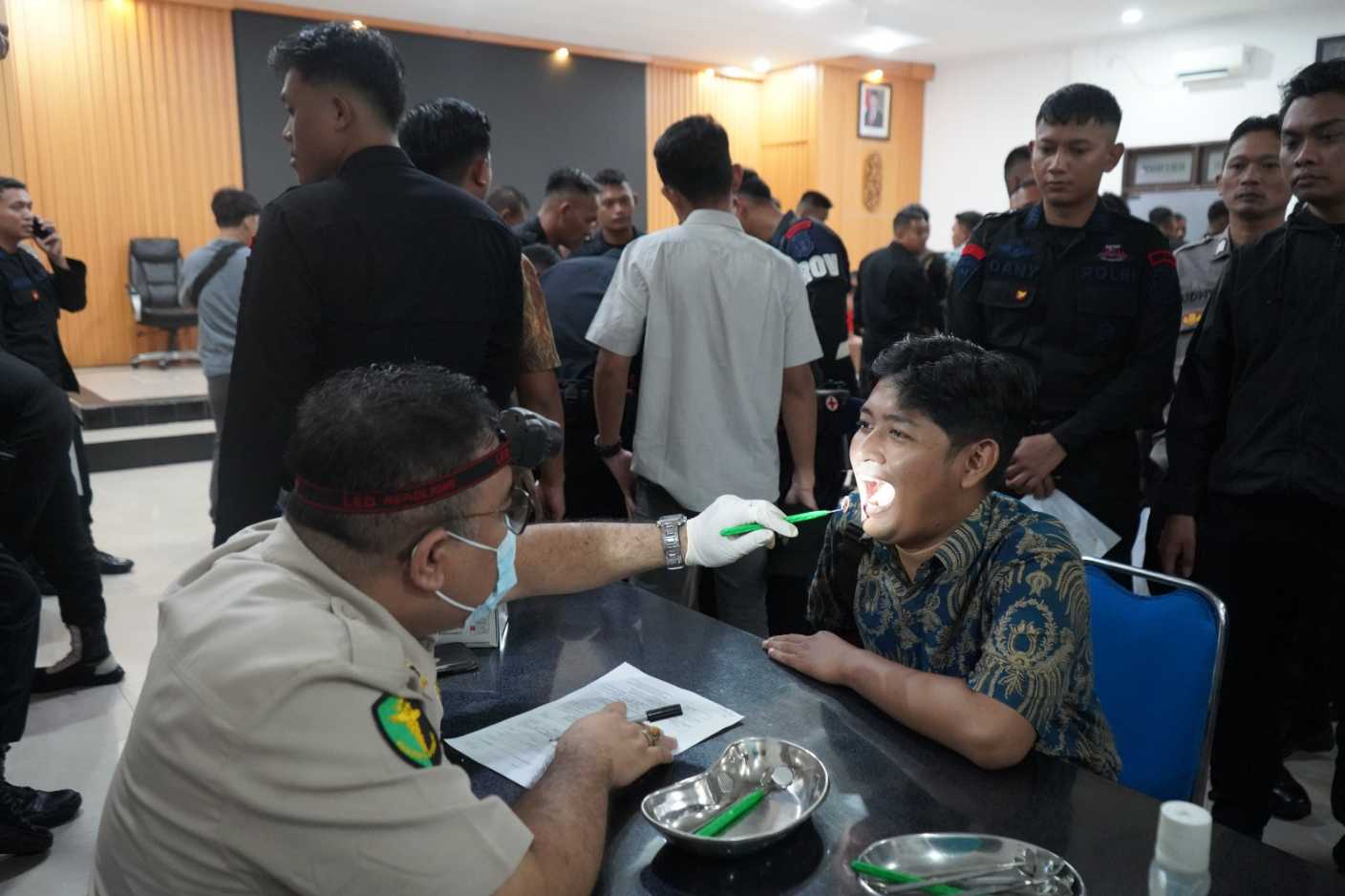 Pemeriksaan meliputi pengecekan tekanan darah, kadar gula darah, suhu tubuh, serta pemeriksaan kesehatan umum guna memastikan kondisi personel tetap prima menjelang pelaksanaan tugas pengamanan.