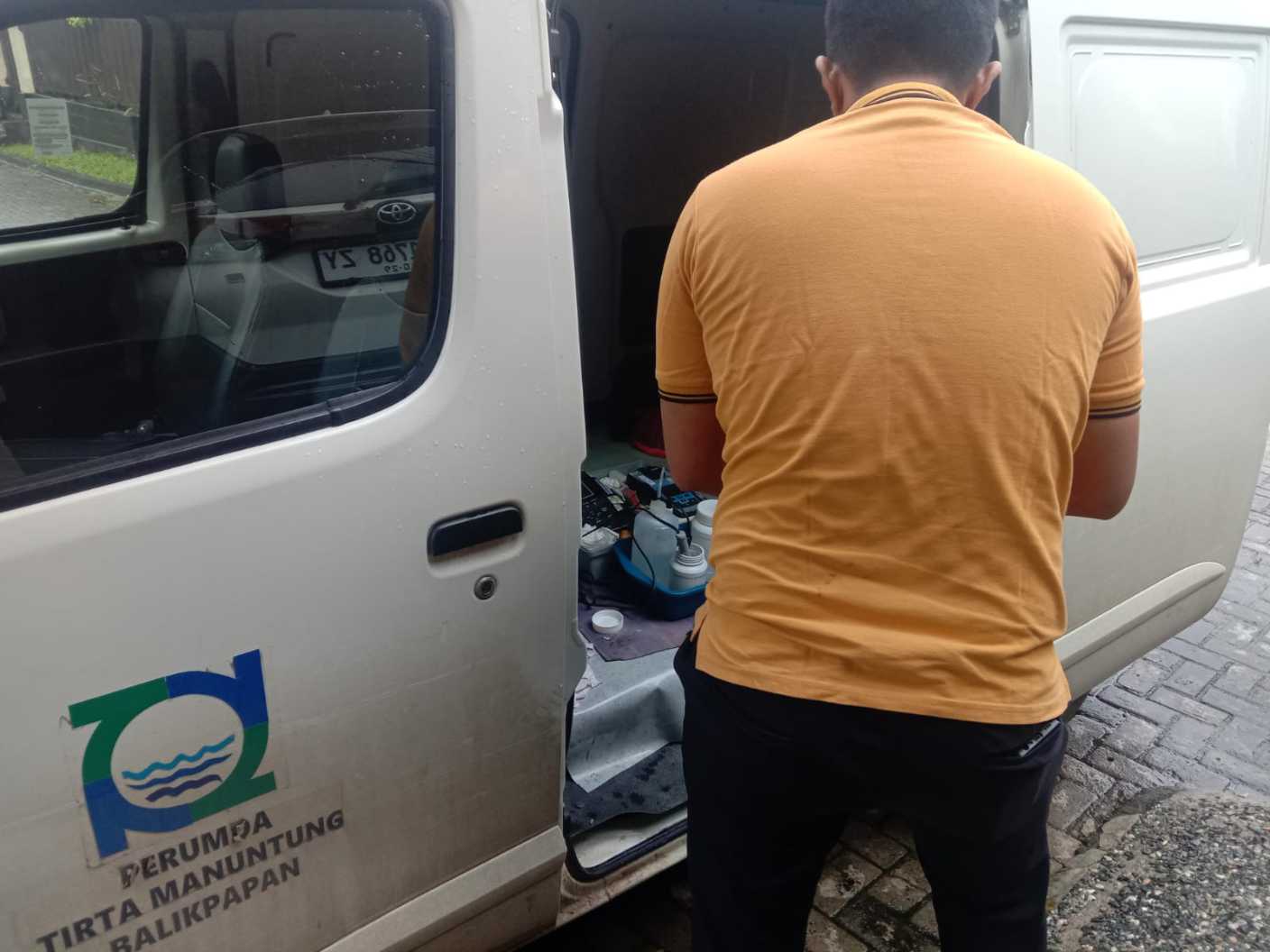 Petugas PDAM Tirta Manuntung saat memeriksa kualitas air PDAM di kawasan RT 15 Wika sebelum Ramadhan.