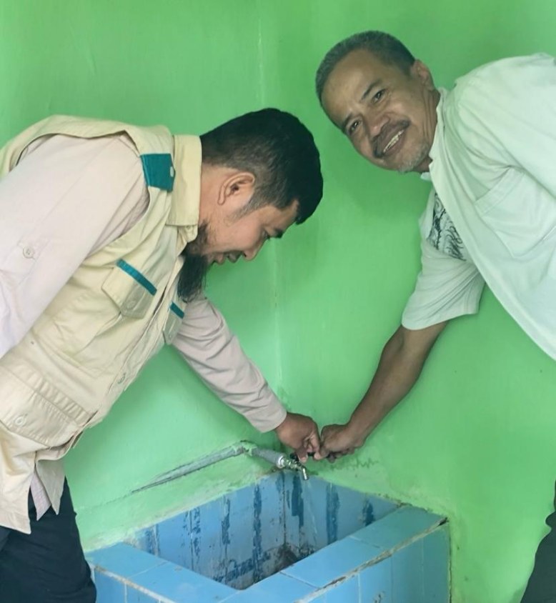 Imron Al Husein, Team Leader Pemeliharaan Gardu Induk ULTG Paser bersama perwakilan MTS Al Ikhlas mencoba keran air sebagai tanda berfungsinya fasilitas MCK dan sanitasi yang baru dibangun melalui program PLN Peduli.