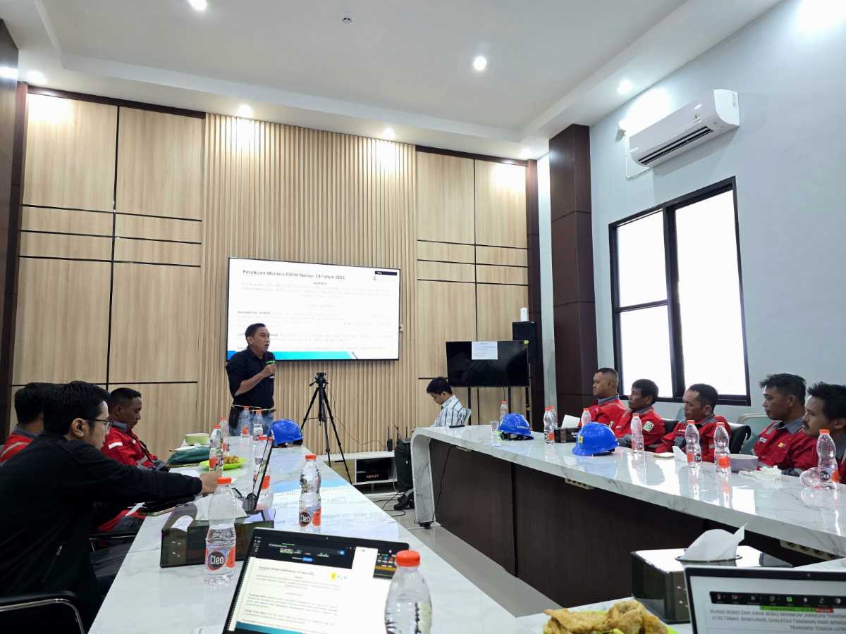 Penyampaian materi oleh narasumber dari PLN UIP3B Kalimantan yang menjelaskan Peraturan Menteri ESDM No. 13 Tahun 2021 tentang Penetapan Kawasan dan Jarak Bebas Minimum pada SUTT/SUTET. Kegiatan ini bertujuan memberikan pemahaman hukum dan keselamatan kerja kepada para petugas PGP.