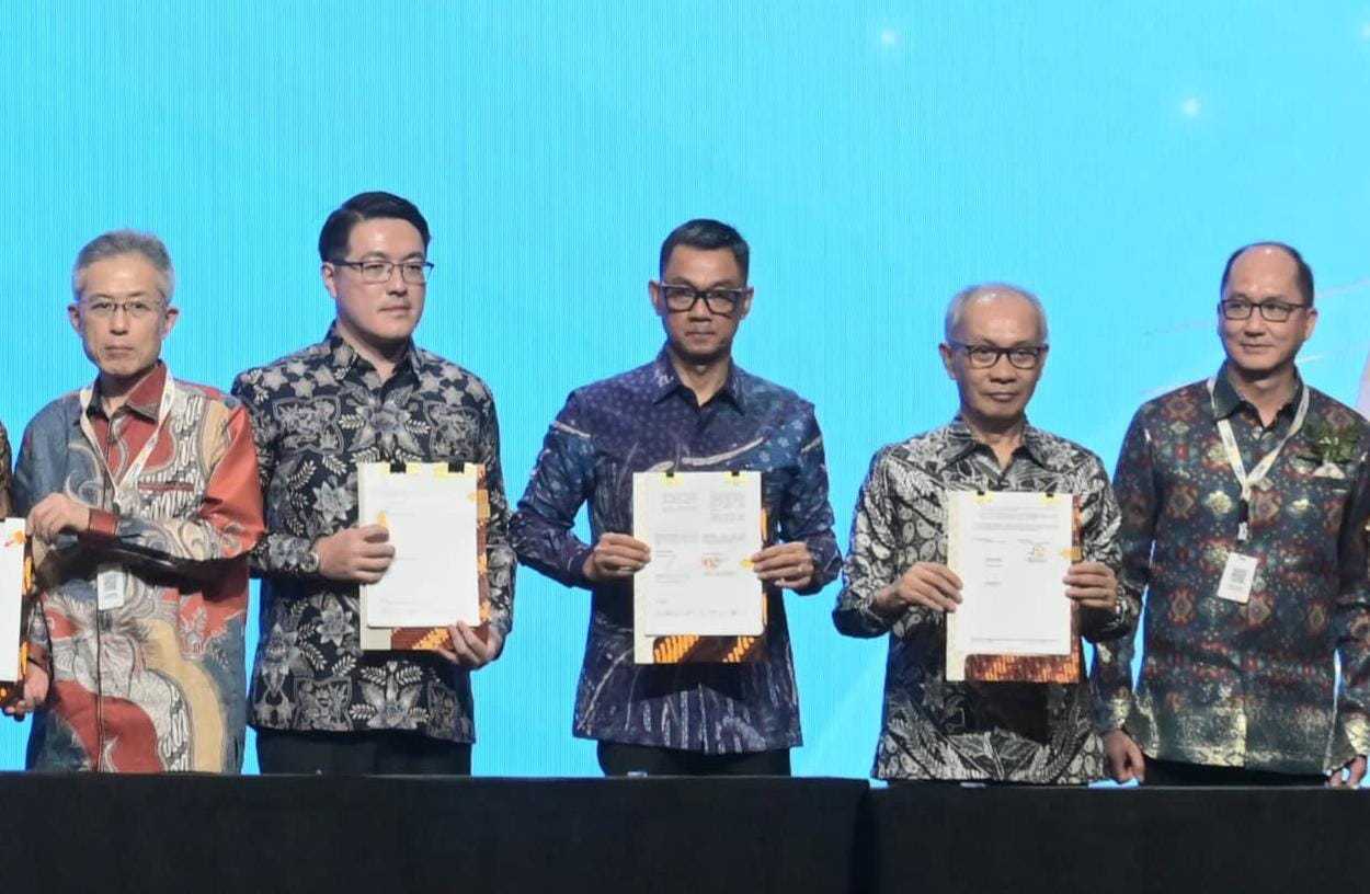 Direktur Utama PLN, Darmawan Prasodjo (tengah) ketika menandatangani Memorandum of Agreement (MoA) bersama Kontraktor Masela PSC – (INPEX Masela Ltd., PT Pertamina Hulu Energi Masela, dan Petronas Masela Sdn. Bhd) dalam rencana pemanfaatan Liquid Natural Gas (LNG) dari proyek Abadi LNG dalam agenda The 49th IPA Convention & Exhibition di ICE BSD, Tangerang pada Rabu (21/5).
