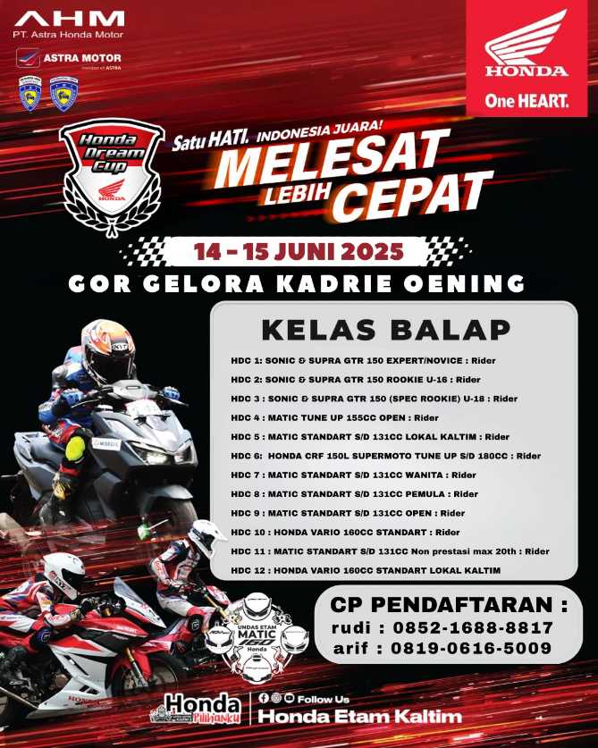 Informasi lebih lanjut kegiatan HDC 2025 di Samarinda dapat diakses melalui akun sosial media resmi Main Dealer Astra Motor Kaltim 2 di instagram @hondaetamkaltim ataupun kanal sosial media Astra Honda Racing Team seperti YouTube Astra Honda Racing Team, Instagram @astrahondaracingteam, dan juga Facebook page Astra Honda Racing Team. (ADV/AI)