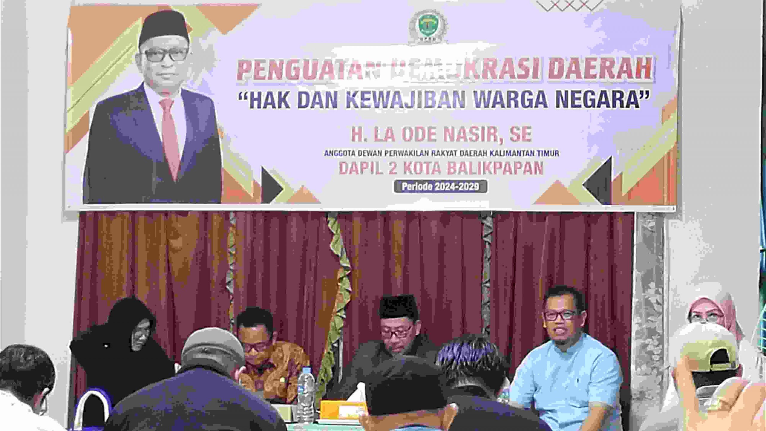 “Sejalan dengan perjalanan waktu dan jaman kita berkewajiban menyampaikan dan saling mengingatkan akan hal-hal berkaitan soal kedudukan hak dan kewajiban sebagai warga negara Indonesia. Bisa melalui sosialisasi atau bentuk lain nya. Pada dasarnya, kita saling peduli, mencintai untuk NKRI dan untuk membawa regenerasi selanjutnya untuk mampu memahami, menguatkan sikap dan menjaga mentalitas.,” Ujar H. La Ode Nasir, SE komisi 1 Anggota DPRD Provinsi Kaltim dari Fraksi Partai Keadilan Sejahtera (PKS) Dapil Balikpapan di dalam acara sosialisasi anggota DPRD Provinsi bertema penguatan Demokrasi daerah, tentang Hak kewajiban WNI di Jalan Padat Karya Kecamatan Balikpapan Utara Jumat,(18/7/’25)Kegiatan ini di hadiri sejumlah masyarakat dari Kecamatan Balikpapan Barat dan sekitarnya di Kota Balikpapan Provinsi Kalimantan Timur (Kaltim). Dan menghadirkan dua nara sumber yaitu H. Hasan Abd Nasir Mantan Anggota DPRD Penajam Paser Utara (PPU) yang juga pembina Yayasan Pendidikan AN NAHL Balikpapan, H.Ibnu Suroso Akademisi, dan undangan khusus anggota DPRD Kota Balikpapan Komisi 4 Hj. Iim Rahman yang juga istri dari H. La Ode Nasir.