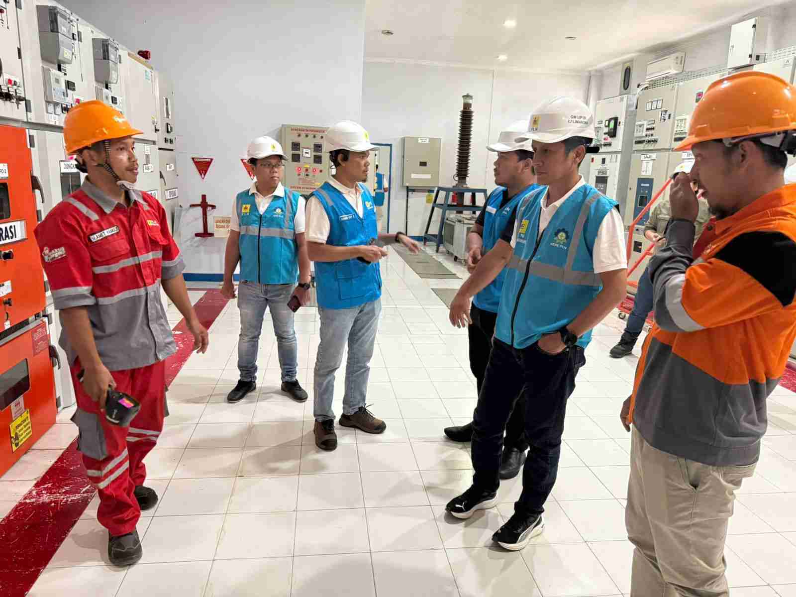 -General Manager UIP3B Kalimantan, Riko Ramadhano Budiawan (tengah, mengenakan rompi biru dan helm putih), memberikan arahan kepada tim operasional saat meninjau langsung Gardu Induk Cendana.