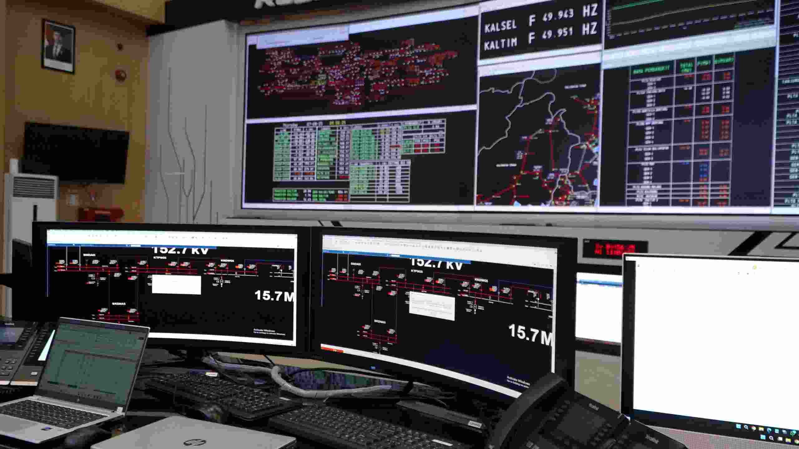 Tampilan sistem pemantauan real-time di ruang kontrol PLN, digunakan memonitor beban, tegangan, dan jaringan transmisi di wilayah Kaltimra