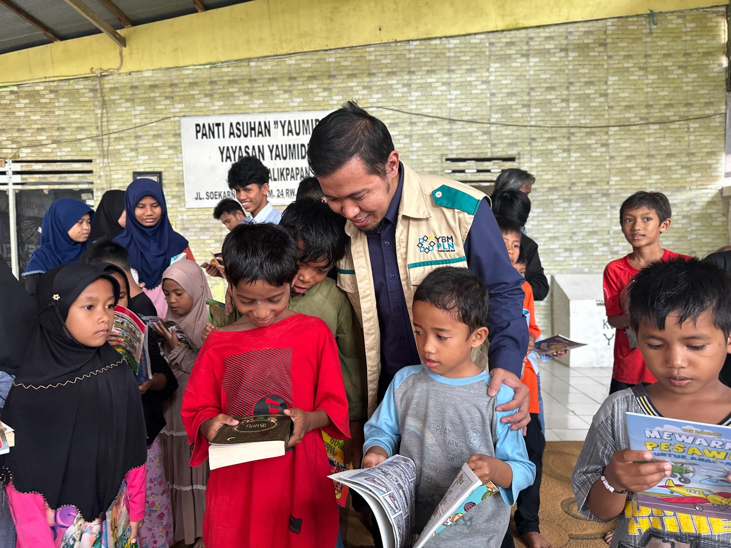 Potret keceriaan anak-anak Panti Asuhan Yaumiddin Balikpapan saat menerima buku bacaan dari PLN UP2B Kaltimra pada peringatan Hari Pelanggan Nasional, (11/9/’25)
