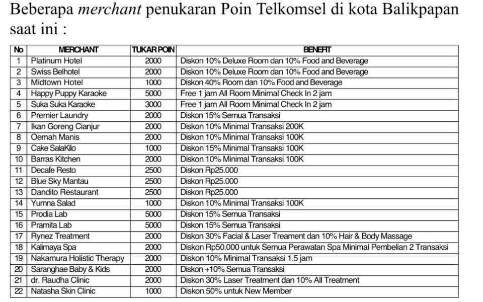 Program ini berlaku hingga 31 Desember 2025, pukul 23.59 WIB. Jadi, jangan biarkan Poin Anda hangus! Segera tukarkan di merchant favorit dan rasakan pengalaman belanja lebih hemat, lebih eksklusif, dan lebih istimewa bersama Telkomsel.