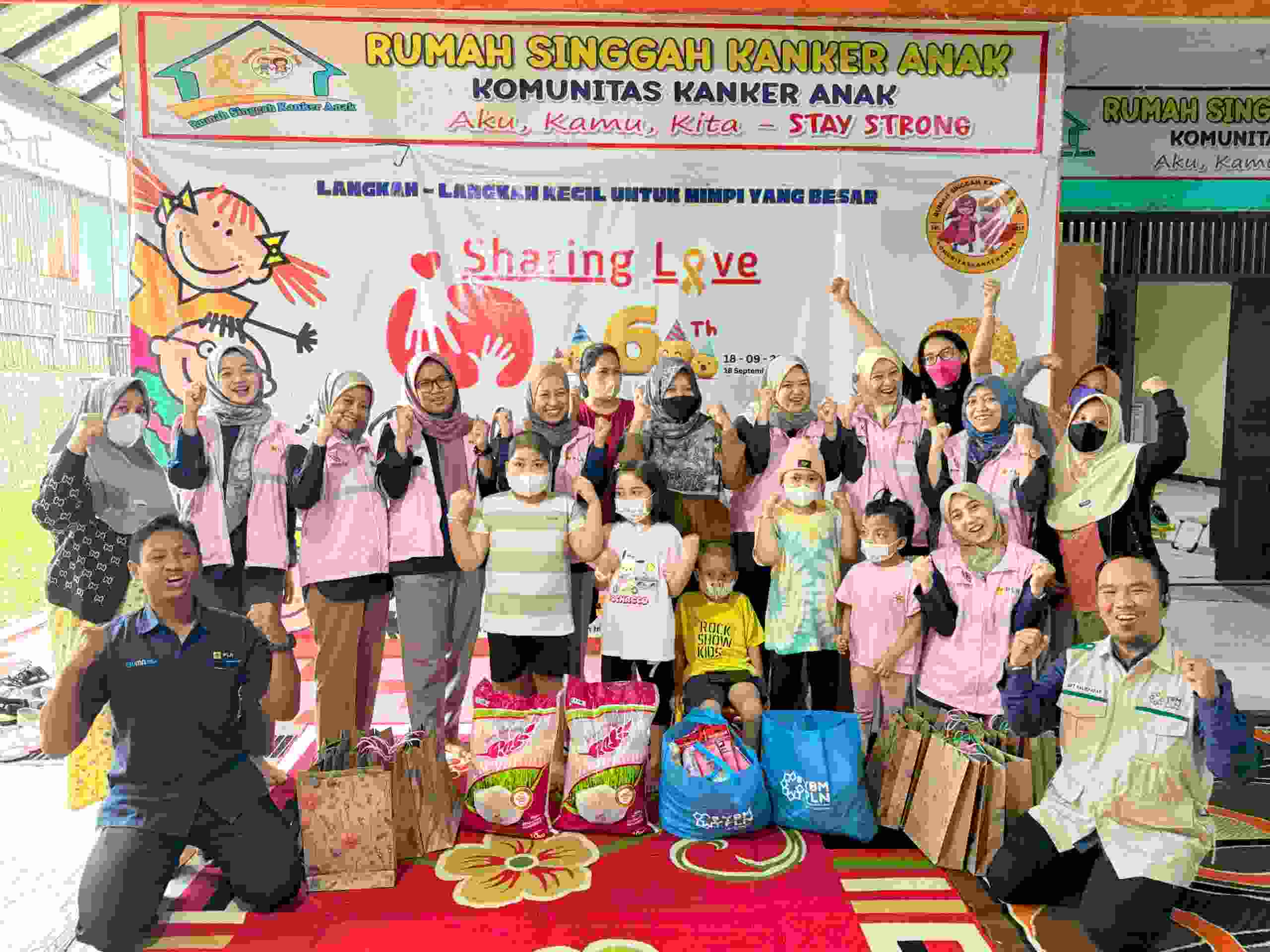 Tim dari PLN UPT Balikpapan terdiri  YBM PLN dan Srikandi PLN berfoto bersama pengelola serta anak-anak Rumah Kanker Anak usai penyerahan bantuan makanan bergizi.