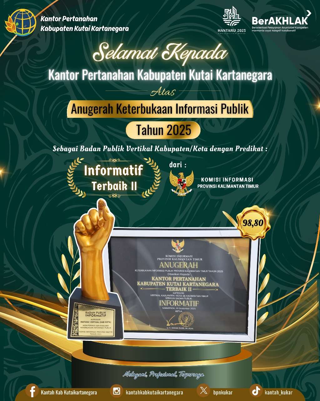 Bagi Kantor Pertanahan Kabupaten Kutai Kartanegara, penghargaan ini menjadi bukti konsistensi dalam menjalankan amanah keterbukaan informasi. Raihan predikat Informatif selama tiga tahun beruntun sejak 2023 meneguhkan komitmen instansi untuk terus melangkah dengan prinsip transparansi, profesionalisme, dan akuntabilitas.