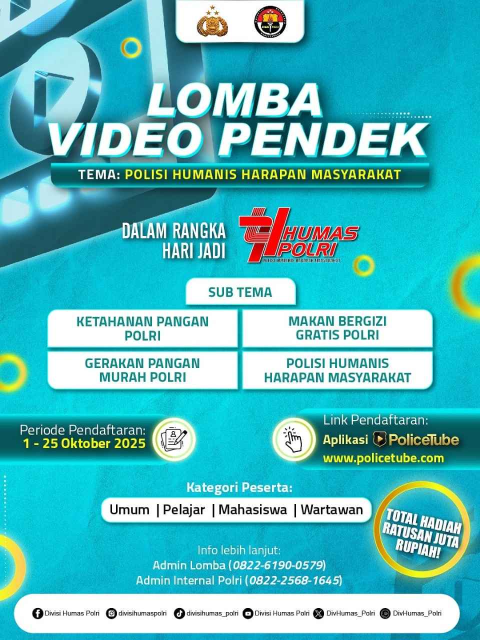 Pendaftaran peserta dibuka mulai 1 hingga 25 Oktober 2025 melalui laman resmi www.policetube.com atau aplikasi PoliceTube, dengan tahapan sosialisasi, penjurian, hingga pengumuman pemenang yang akan disiarkan secara live di kanal media sosial @Divisihumaspolri pada 27 Oktober 2025.