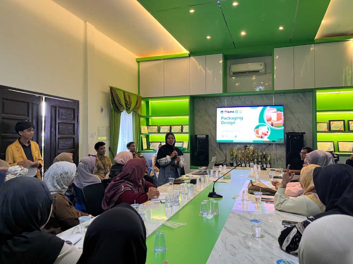 Pelatihan dibuka dengan sesi praktik desain kemasan yang dipandu oleh ibu Ummi Khuzaimah, S.Gz., M.Si. Peserta mempelajari prinsip kemasan efektif dengan identitas merek yang konsisten, hierarki informasi yang jelas, dan kepatuhan label pangan serta mengaplikasikannya langsung di Canva untuk menghasilkan draf label siap pakai.