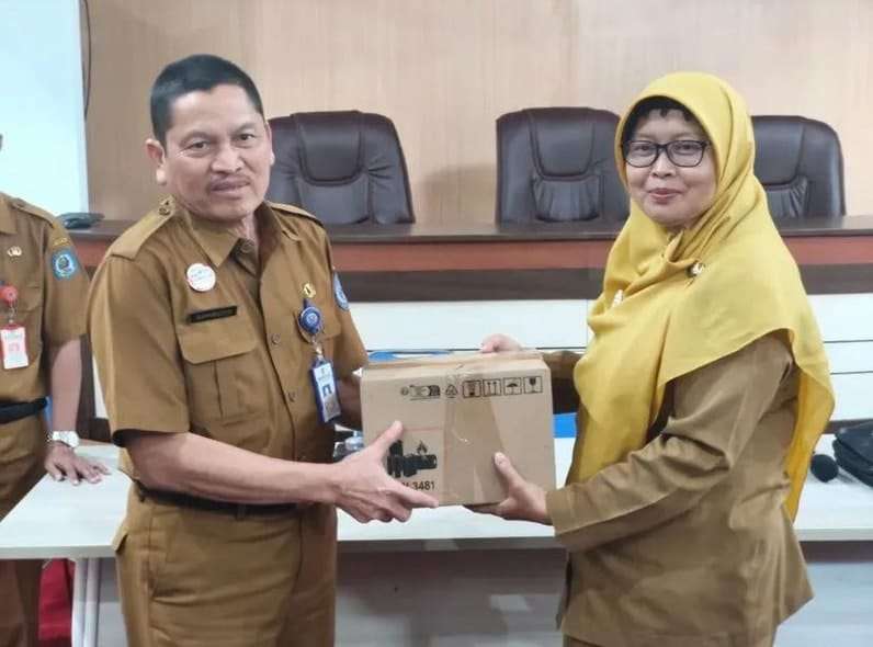 Teks: Sekretaris Disdikbud Bontang, menyerahkan Tablet pintar kepada sembilan SMP se- Kota Bontang.