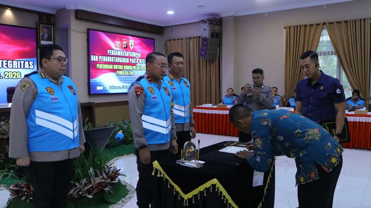 BALIKPAPAN,Swarakaltim.com. Polda Kalimantan Timur (Kaltim) menggelar kegiatan Pengambilan Sumpah dan Penandatanganan Pakta Integritas bagi peserta Penerimaan Bintara Brimob Tahun Anggaran 2026. Kegiatan ini berlangsung di Gedung Mahakam Polda Kaltim, sebagai komitmen mewujudkan proses rekrutmen Polri yang bersih, transparan, dan berintegritas pada Rabu,(19/11/’25),