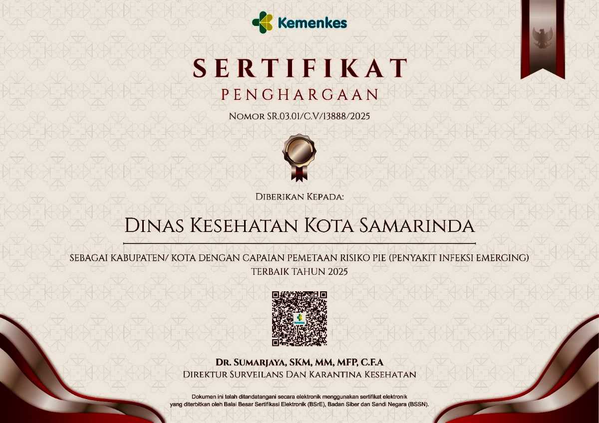 SAMARINDA, Swarakaltim.com – Dinas Kesehatan (Dinkes) Kota Samarinda meraih penghargaan nasional sebagai terbaik pertama kabupaten/kota se-Provinsi Kalimantan Timur dalam pemetaan risiko Penyakit Infeksi Emerging (PIE) tahun 2025. Penghargaan tersebut diberikan oleh Kementerian Kesehatan Republik Indonesia melalui Direktorat Surveilans dan Karantina Kesehatan.