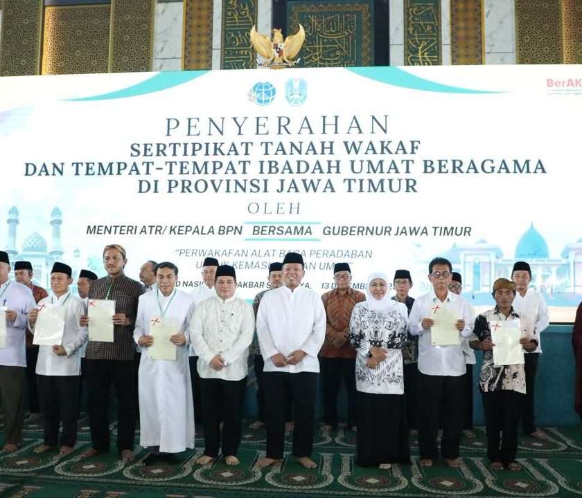 Surabaya, Swarakaltim.com – Menteri Agraria dan Tata Ruang/Kepala Badan Pertanahan Nasional (ATR/BPN), Nusron Wahid, bersama Gubernur Jawa Timur, Khofifah Indar Parawansa, menyerahkan sebanyak 2.532 sertipikat tanah wakaf dan rumah ibadah. Penyerahan tersebut berlangsung di Masjid Nasional Al-Akbar Surabaya, Sabtu (13/12/2025). Dalam kesempatan itu, Menteri Nusron menegaskan pentingnya kolaborasi antara pemerintah pusat dan daerah, lembaga […]